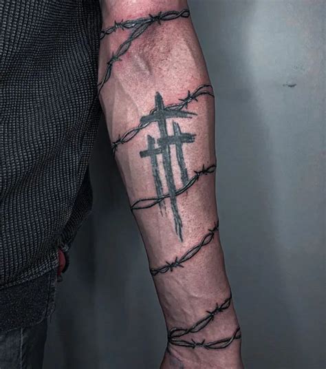 Barbed Wire Cross Tattoo, The barbed wires are linked together, wrapping all the way around the bicep and arm. Wooden banner & barbed design ideas for tattoos