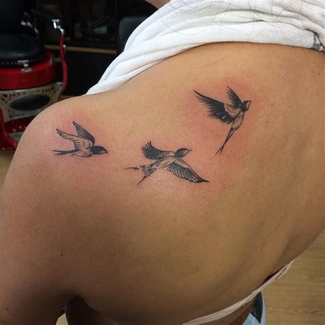Shoulder tattoos can come in many different sizes from small to large. The tattoo is of three little birds drawn on the back of a shoulder to show that the birds are flying towards each other. A small tattoo but a beautiful one. February 14, 2021 by rob cole. Little flying birds shoulder tattoo.