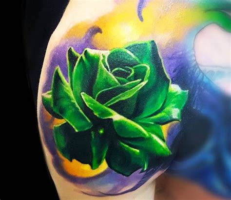 What does a green rose tattoo mean? A dark red rose tattoo designed on the top of the shoulder. Green rose with leaves in star tattoo design by gem hart by gem hart. What makes this tattoo more interesting is the presence of thorns in the tattoo which symbolize that every good thing comes with something. Only the minority are.