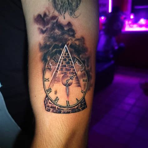 You can choose to add a clock symbol to a pyramid tattoo to bring in symbolism about time. Classic pyramid clock tattoo on forearm. Illuminati eye pyramid with clock tattoo design for forearm. For information or support about tattoo,. Burning pyramid eyes tattoo with flames.