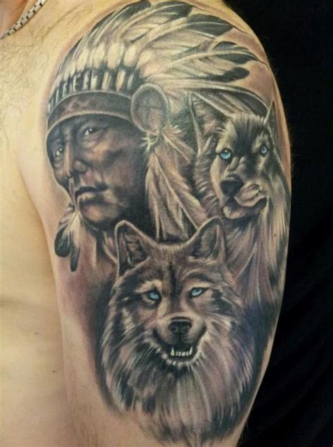 Grey ink indian chief with two wolf tattoo on man chest by josh hobden. The wolf tattoo is not for those of light heart. Whatever symbolism your wolf depicts, there is a range of awesome technical options and tattoo style that can bring it to life. Grey ink 3d wolf head indian chief tattoo on left half sleeve. To assist.